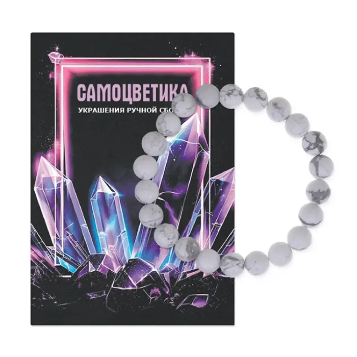 Стрейч-браслет, собранный вручную из каменных бусин диаметром 8 мм, представляет собой стильное и универсальное украшение. Браслет упакован в полипропиленовый пакет с европодвесом и снабжён этикеткой с кратким описанием камня. В комплект входит буклет, который содержит информацию о магических свойствах натуральных и синтетических камней, а также бусин и подвесок-амулетов.