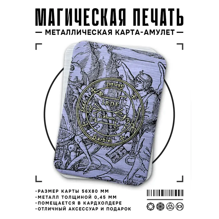 Магическая карта «Амулет устранения страха и бессилия» — это уникальный аксессуар размером 5,6х8 см, выполненный из металла толщиной 0,45 мм. Этот пантакль черпает свою силу от духов Юпитера и Скорпиона, что придаёт ему способности рассеивать страх и помогать в борьбе с чувством бессилия. Упаковка включает полипропиленовый пакетик с этикеткой, на которой представлено описание значения символа. Такой амулет станет отличным подарком для тех, кто ищет поддержку в трудные времена или стремится к внутреннему равновесию.