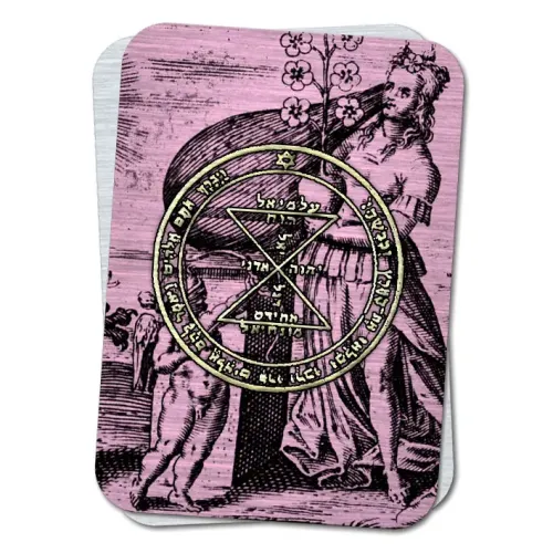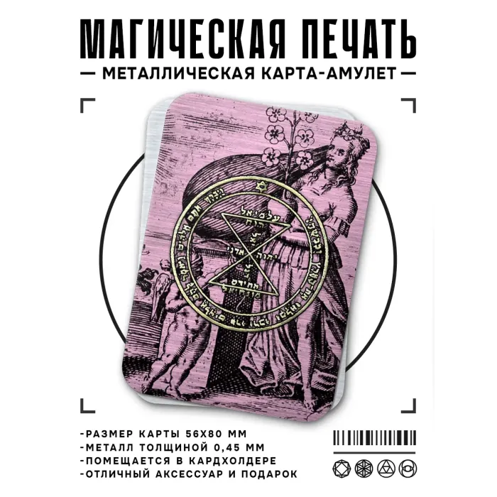 Магическая карта «Амулет привлечения любви» — это уникальный сувенир, который помогает создать атмосферу романтики и привязанности. Изготовленная из металла размером 5,6х8 см и толщиной 0,45 мм, она украшена Третьим Пентаклем Венеры. Этот символ традиционно используется для привлечения любви и гармонии в отношениях. Ангел Монахиэль (Monachiel) считается покровителем этой карты, помогая открыть сердце для новых чувств.