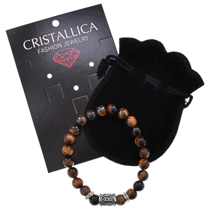 Браслет из коллекции Cristallica с бусинами из натурального тигрового глаза и подвеской-руной Феху.
