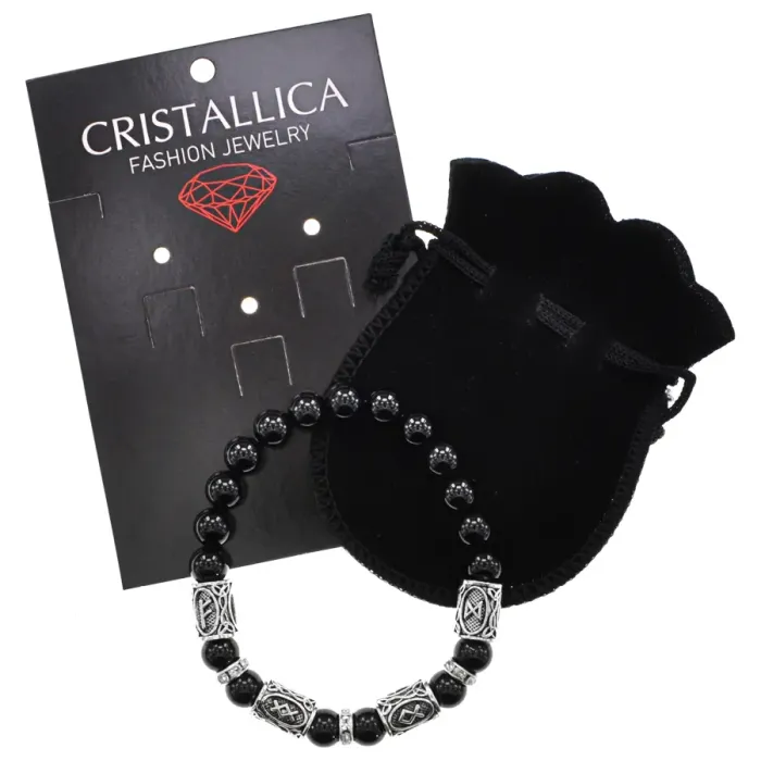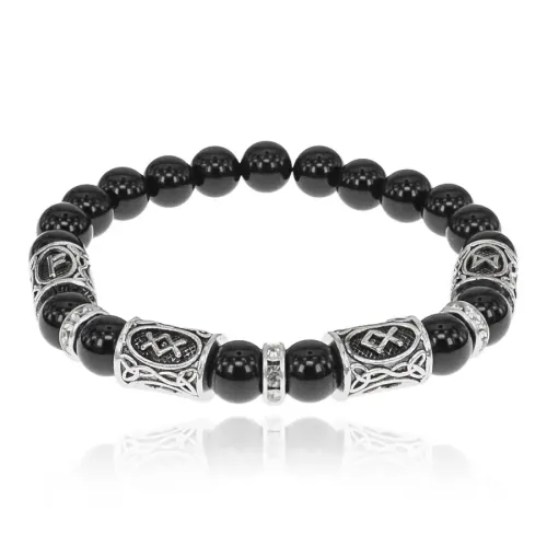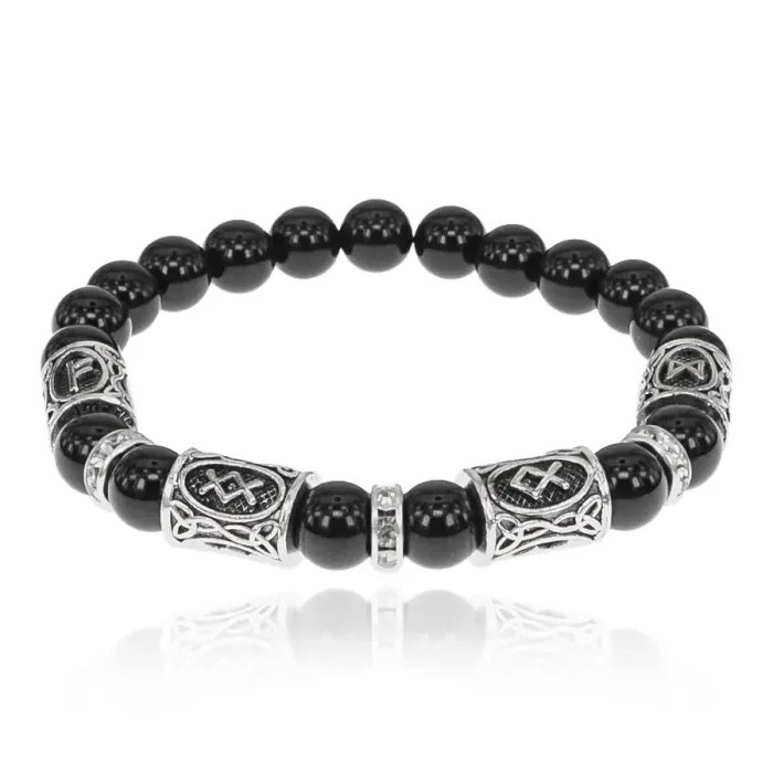 Браслет из натурального чёрного агата с бусинами диаметром 8 мм, украшенный рунами.