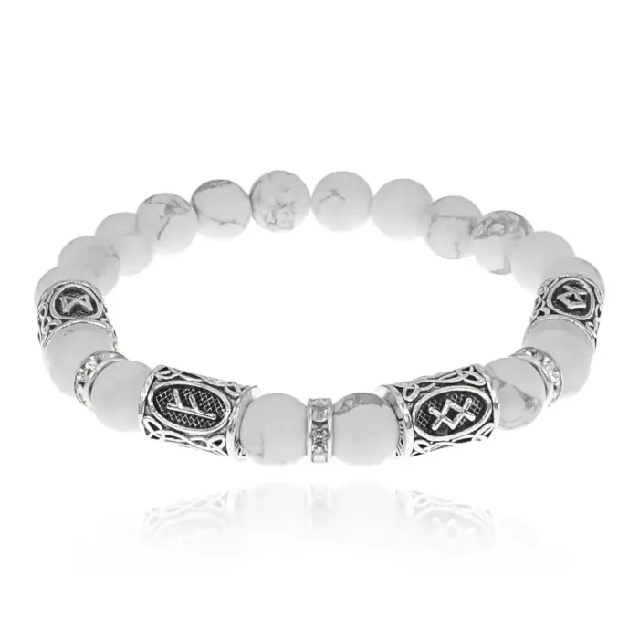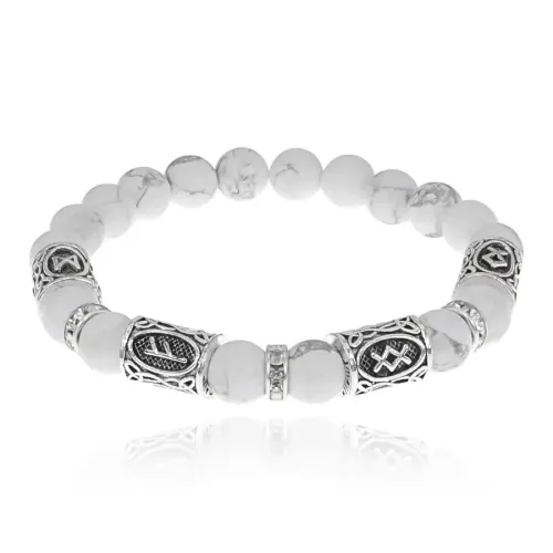 Материал и изготовление: Бусины диаметром 8 мм из натурального камня кахолонг. Украшен руническими символами и разделителями со стразами.