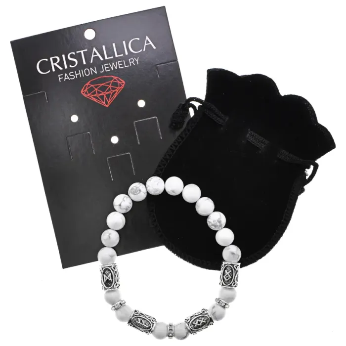 Стрейч-браслет из коллекции Cristallica. Изготовлен из натурального камня кахолонг, украшен руническими символами и стразами.
