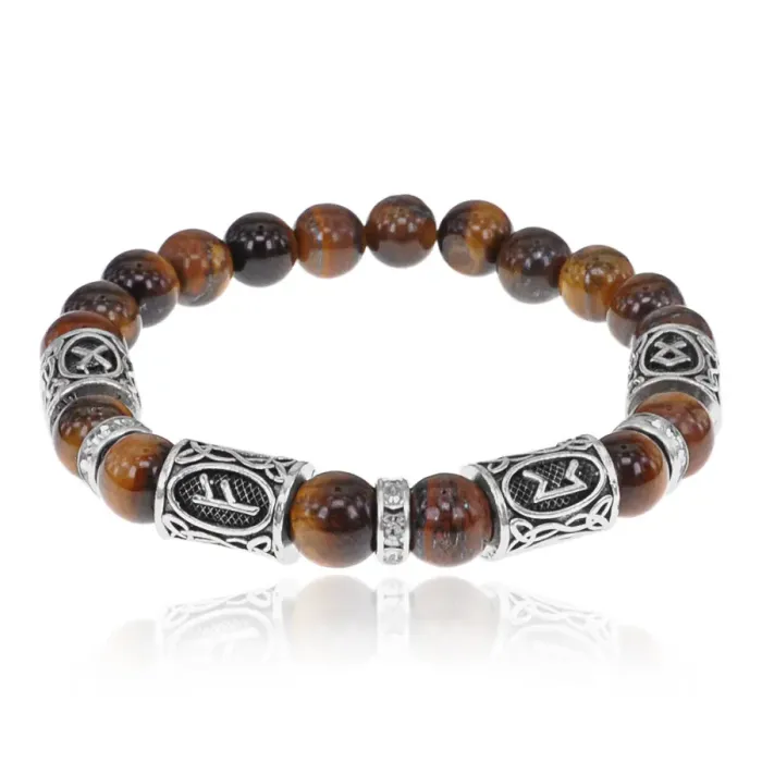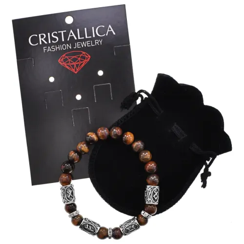 Стрейч-браслет из коллекции Cristallica, выполненный из бижутерного сплава и натурального камня тигровый глаз, с нанесёнными руническими символами.