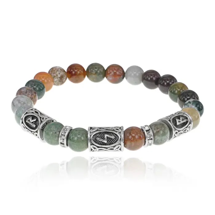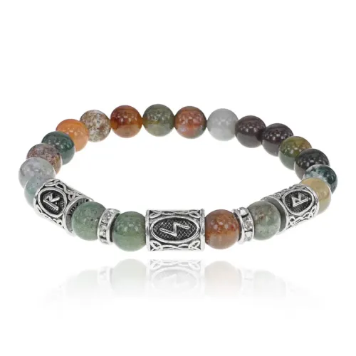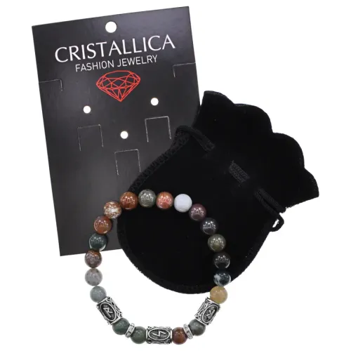 Стрейч-браслет коллекции Cristallica из натуральной песочной яшмы с рунами из бижутерного сплава и разделителями со стразами.