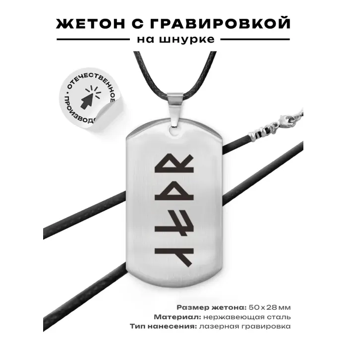 Амулет-жетон для сувенирного или личного использования, изготовлен из нержавеющей стали с полированной поверхностью. На изделие нанесена славянская руническая формула.
