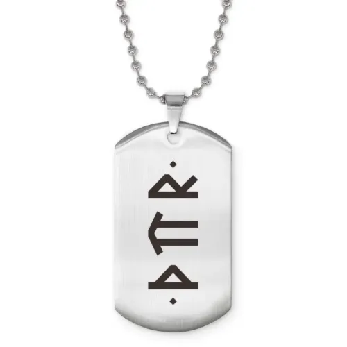 Жетон на цепочке со славянской рунической формулой. Изготовлен из нержавеющей стали, изображение нанесено лазерной гравировкой.