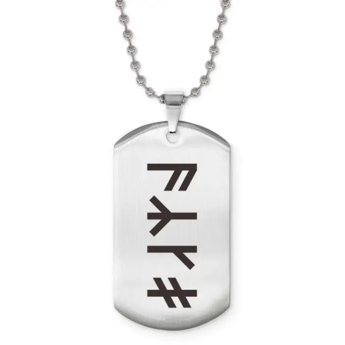 Жетон на цепочке со славянской рунической формулой. Изготовлен из нержавеющей стали с лазерной гравировкой.