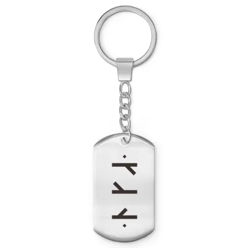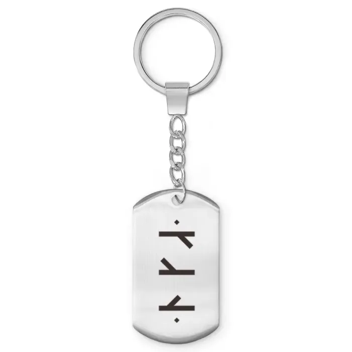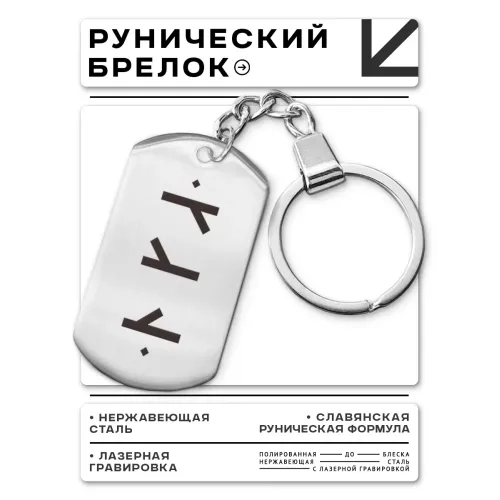Брелок-жетон из полированной нержавеющей стали с нанесённой славянской рунической формулой.
