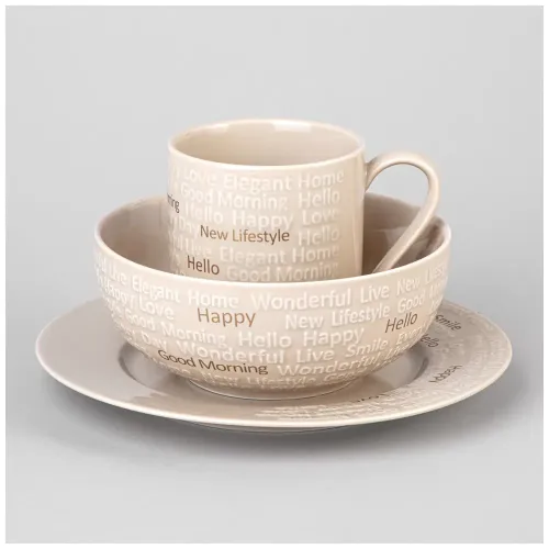 Набор для завтрака Good Morning из трёх предметов предназначен для сервировки утренних блюд. Комплект выполнен из керамики высокого качества в бежевом цвете, что обеспечивает нейтральное сочетание с различной кухонной утварью.