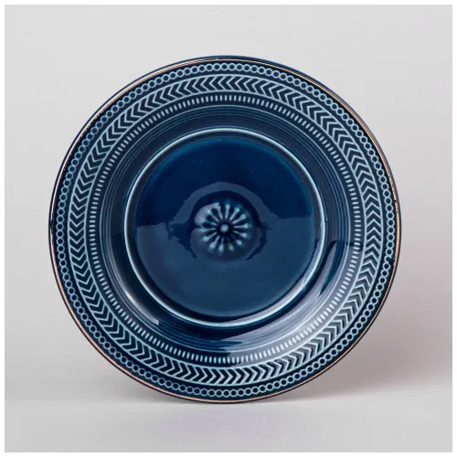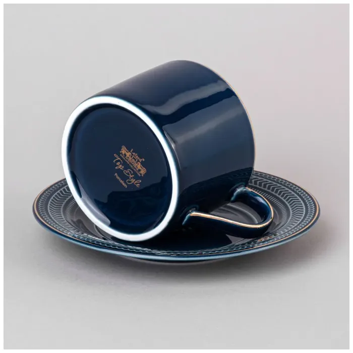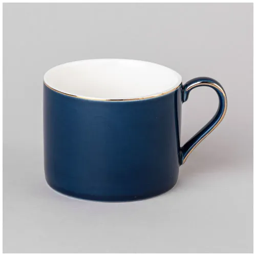 Посуда изготовлена из фарфора, материала, отличающегося прочностью и устойчивостью к повреждениям. Объём чашки составляет 250 миллилитров. Дизайн выполнен в глубоком синем цвете.