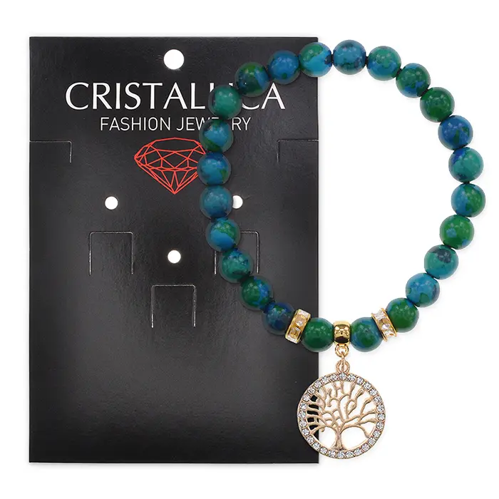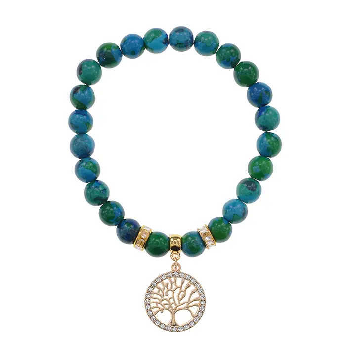 Стрейч-браслет из синтетического камня хризоколлы с дизайном «Дерево жизни» и фурнитурой светлого золота.