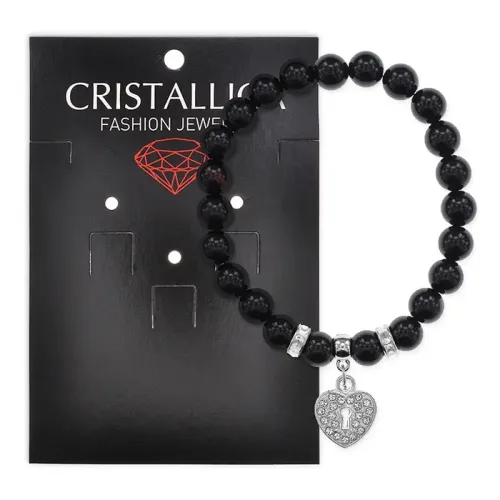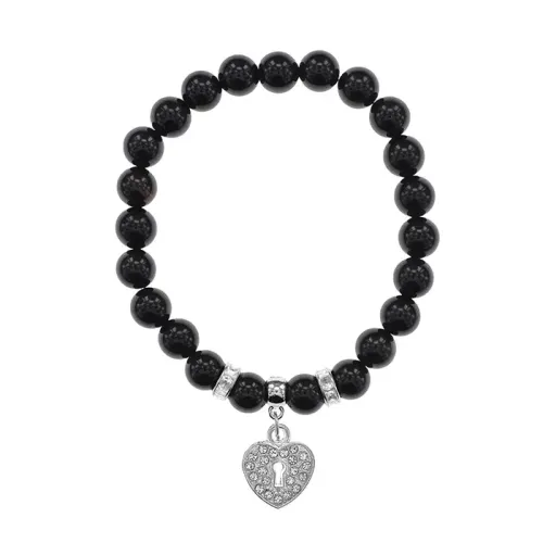 Стрейч-браслет из натурального чёрного агата с подвеской в виде сердца и серебряной фурнитурой.