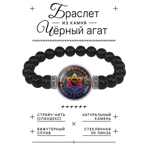 Материал и изготовление: Бусины из черного агата диаметром 8 мм. Амулет с изображением звезды диаметром 20 мм под выпуклой стеклянной линзой. Металлические элементы из бижутерного сплава с покрытием под серебро.