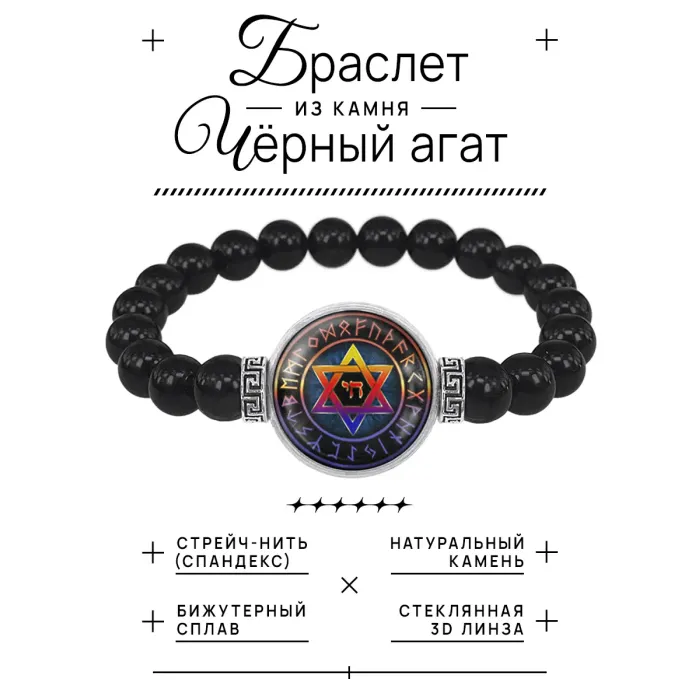 Стрейч-браслет с амулетом Звезда Давида. Материалы: бусины черного агата, бижутерный сплав, стекло.