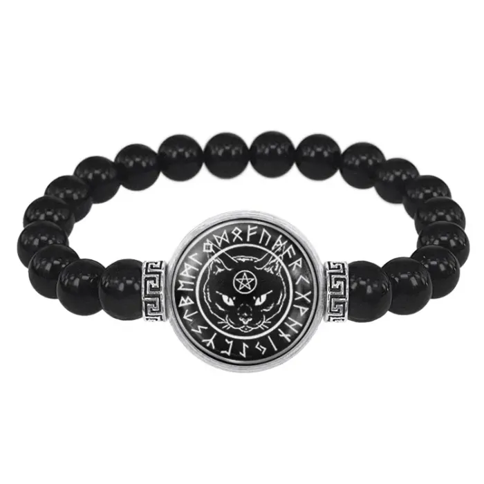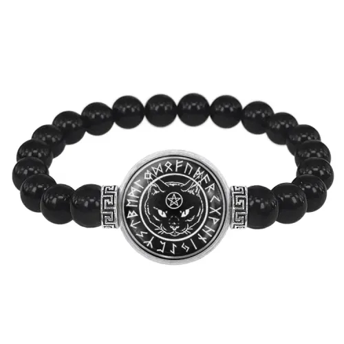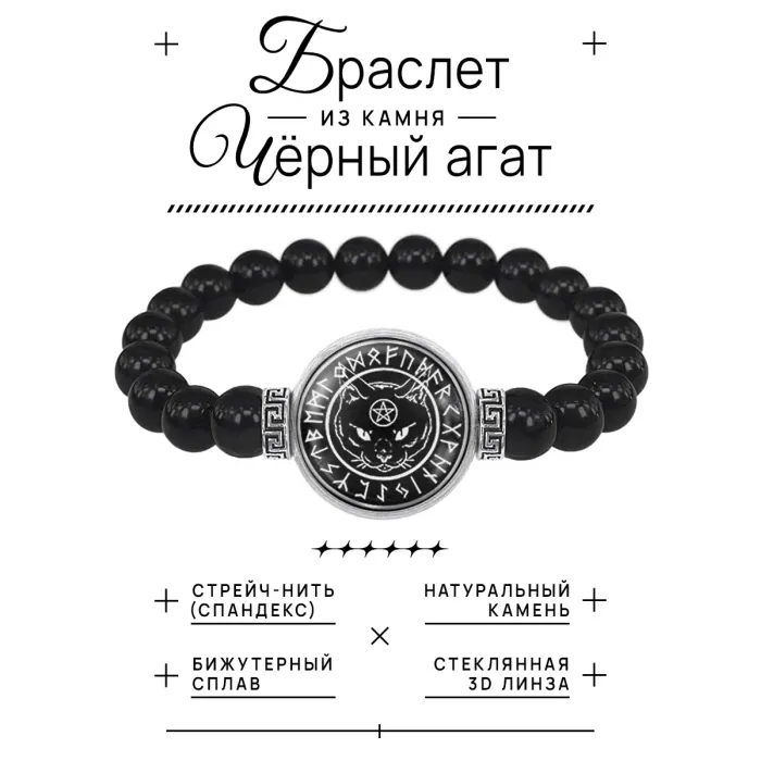 Стрейч-браслет из бусин чёрного агата с центральным элементом в виде изображения чёрного кота под стеклянной линзой.