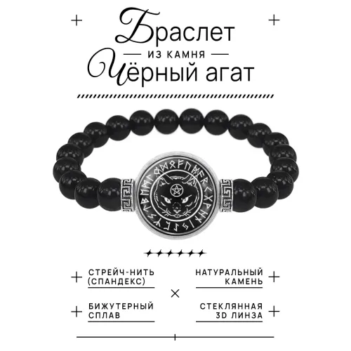 Материал и изготовление: Бусины из чёрного агата диаметром 8 мм, центральный элемент из бижутерного сплава с покрытием под серебро и выпуклой стеклянной линзой.