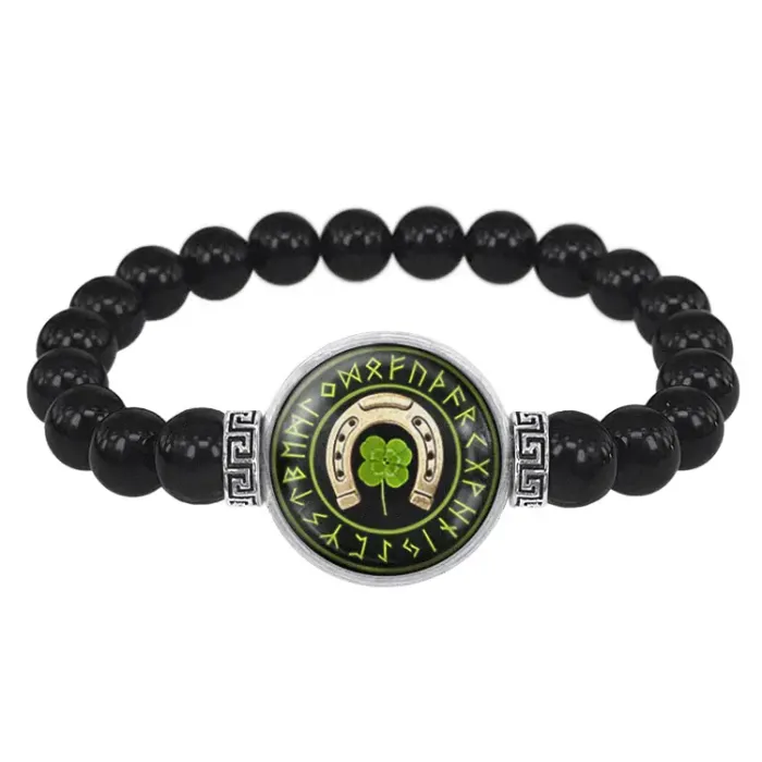Стрейч-браслет из бусин чёрного агата с декоративным элементом под стеклянной линзой.