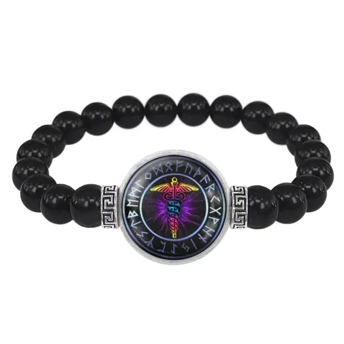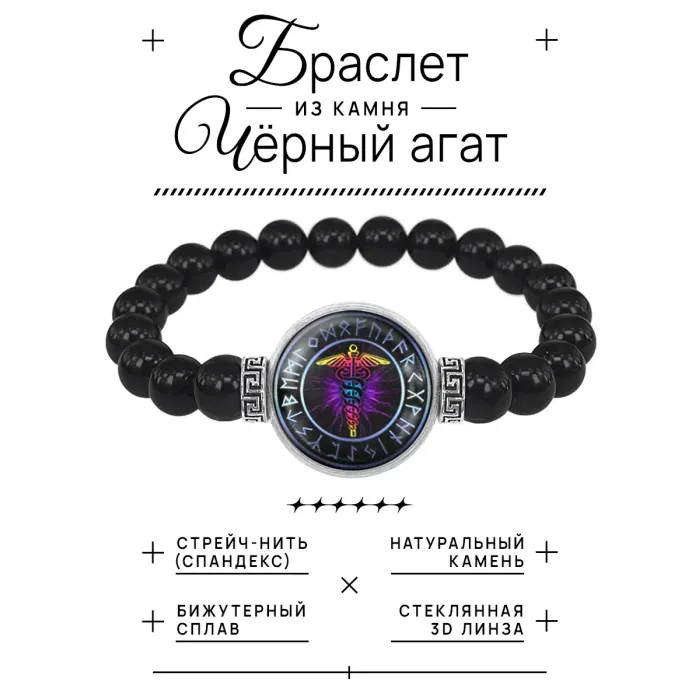 Стрейч-браслет из натурального чёрного агата с центральным элементом, украшенным изображением под выпуклой стеклянной линзой.