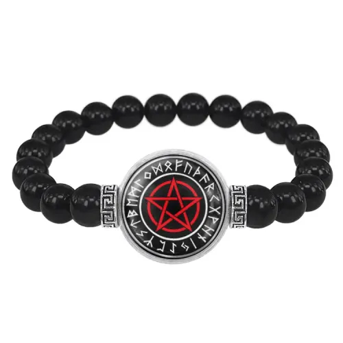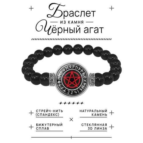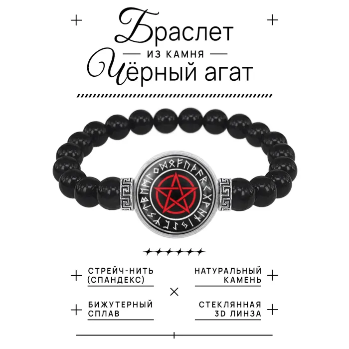 Стрейч-браслет из бусин черного агата с кулоном в виде пентаграммы под стеклянной линзой.