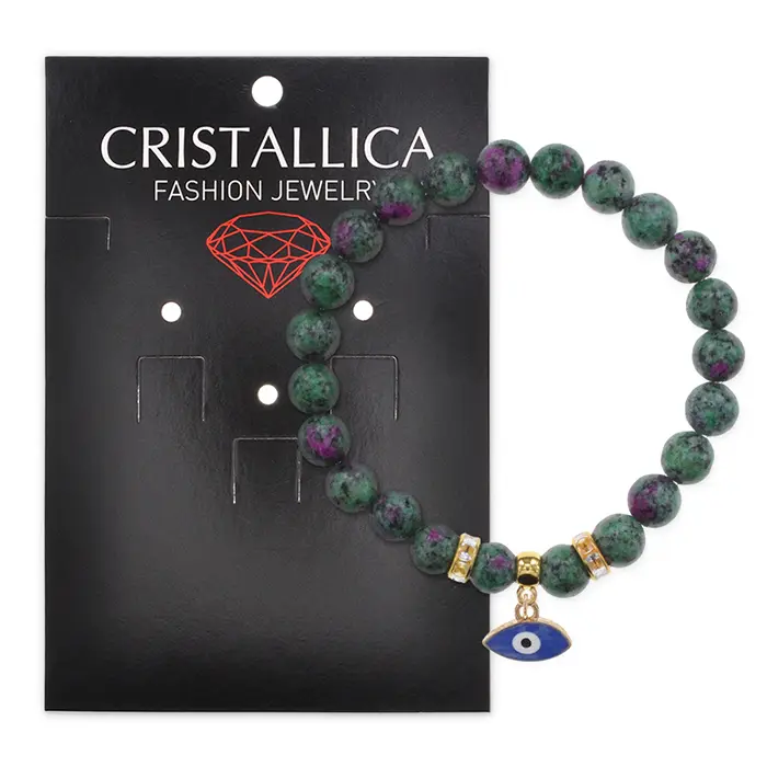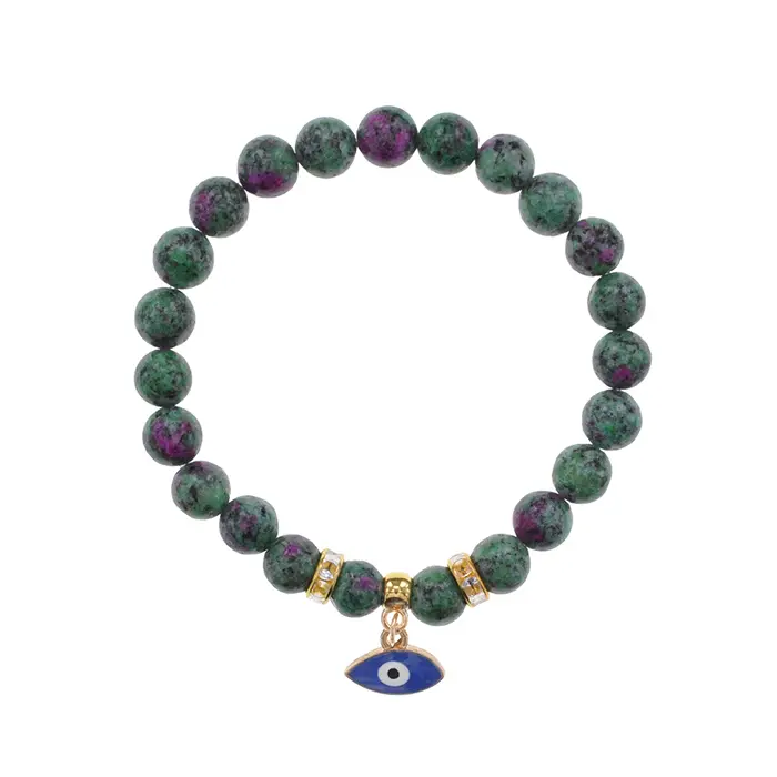 Стрейч-браслет с символом глаза, выполненный из синтетического камня цоизит и украшенный стразами.