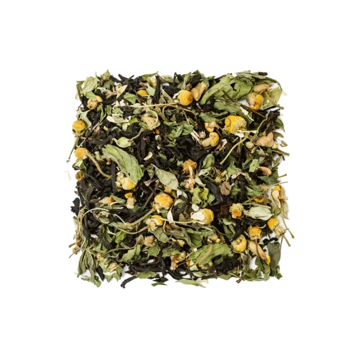 Этот ароматный купаж создан на основе премиального чёрного чая, обогащённого листьями мяты, чабреца и цветками ромашки. Настой получается прозрачным, светло-орехового цвета, с ярким травяно-цветочным букетом. Вкус насыщенный и многогранный — с лёгкой горчинкой ромашки и освежающим мятным холодком.