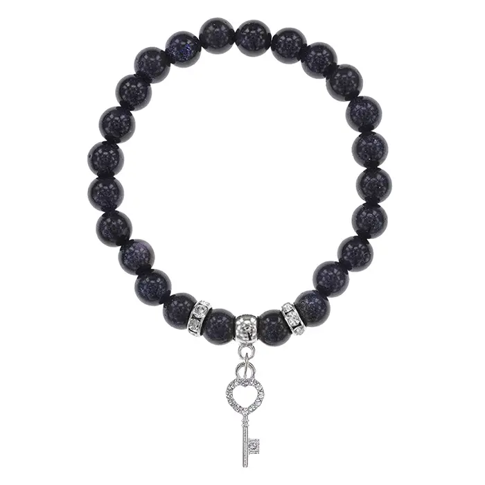Стрейч-браслет из синтетического камня синий авантюрин с декоративным элементом в виде ключа и стразами.