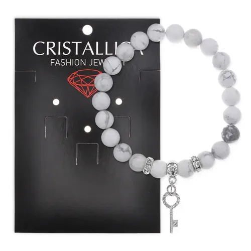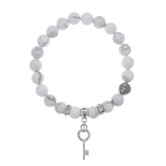 Стрейч-браслет из натурального камня кахолонг с серебристой фурнитурой и подвеской в виде ключа.