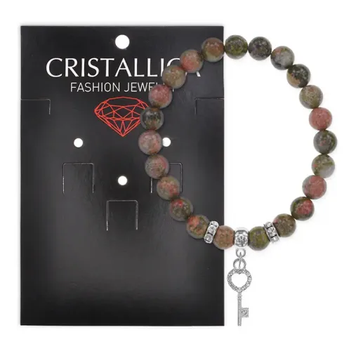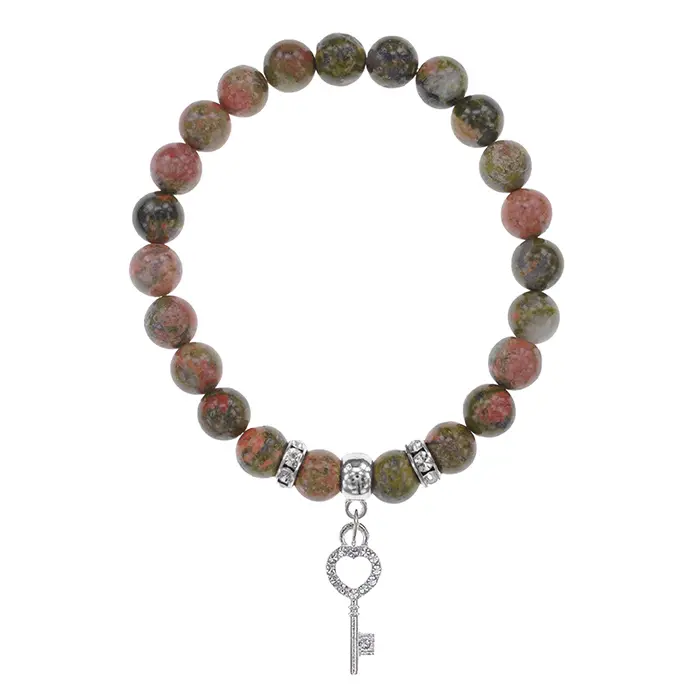 Браслет из натурального камня унакит с подвеской в виде ключа и элементами из страз.