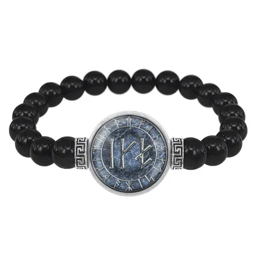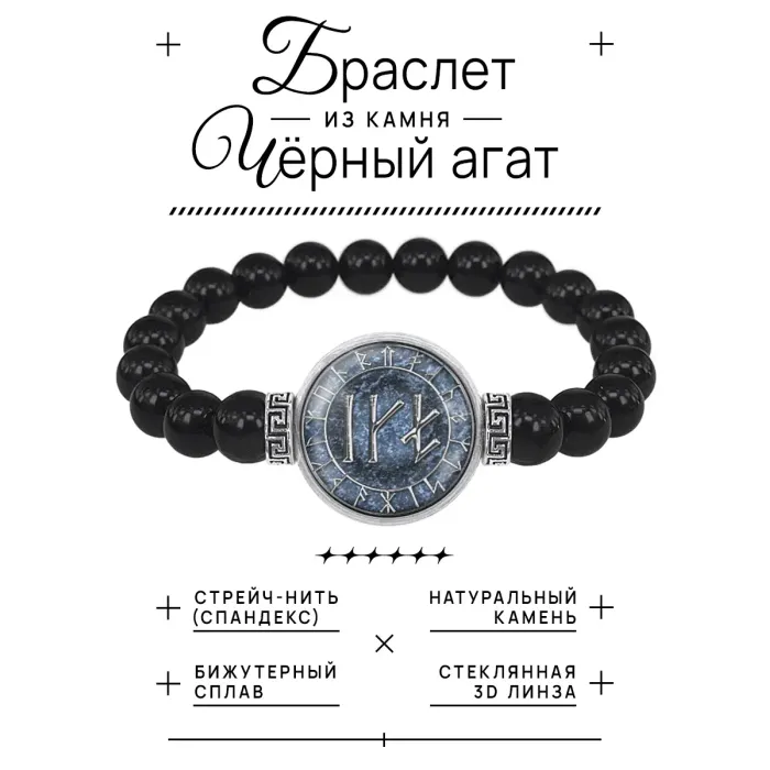 Стрейч-браслет из бусин чёрного агата с изображением под выпуклой стеклянной линзой.