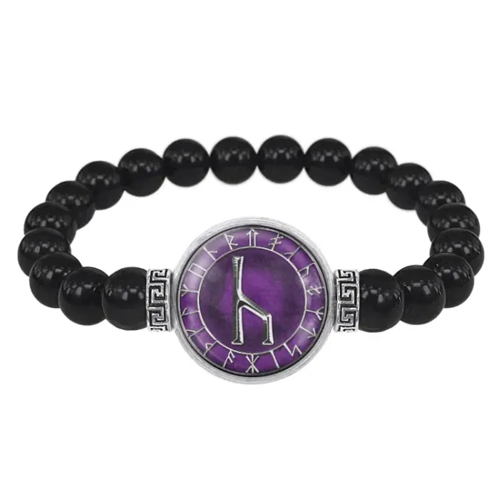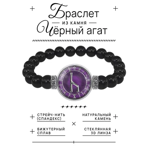Стрейч-браслет из черного агата с символом руны Уд под стеклянной линзой.