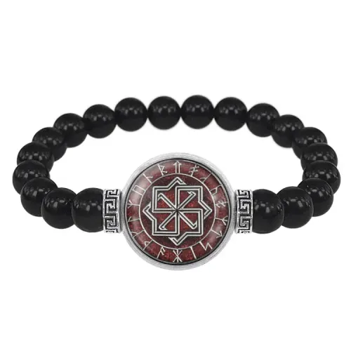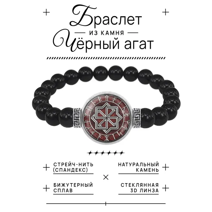 Материал и изготовление: Бусины из черного агата диаметром 8 мм, фурнитура из бижутерного сплава с покрытием под серебро. Изображение символа расположено под выпуклой стеклянной линзой диаметром 20 мм.