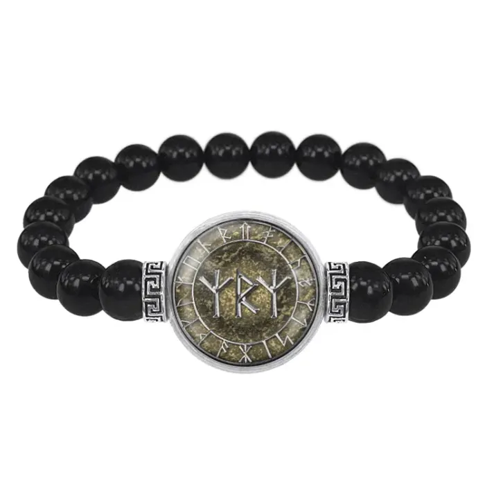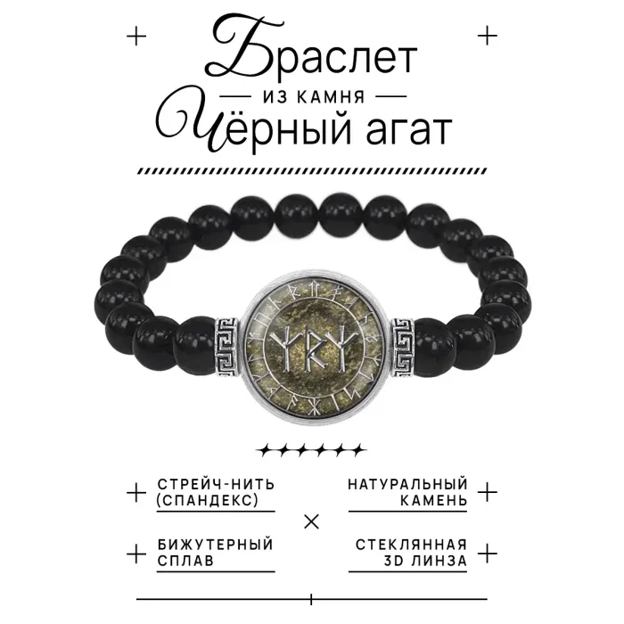 Стрейч-браслет с амулетом 'Защита в путешествиях' из черного агата и бижутерного сплава с изображением под стеклянной линзой.