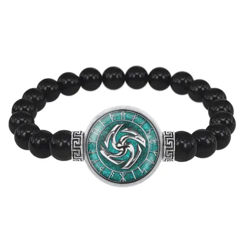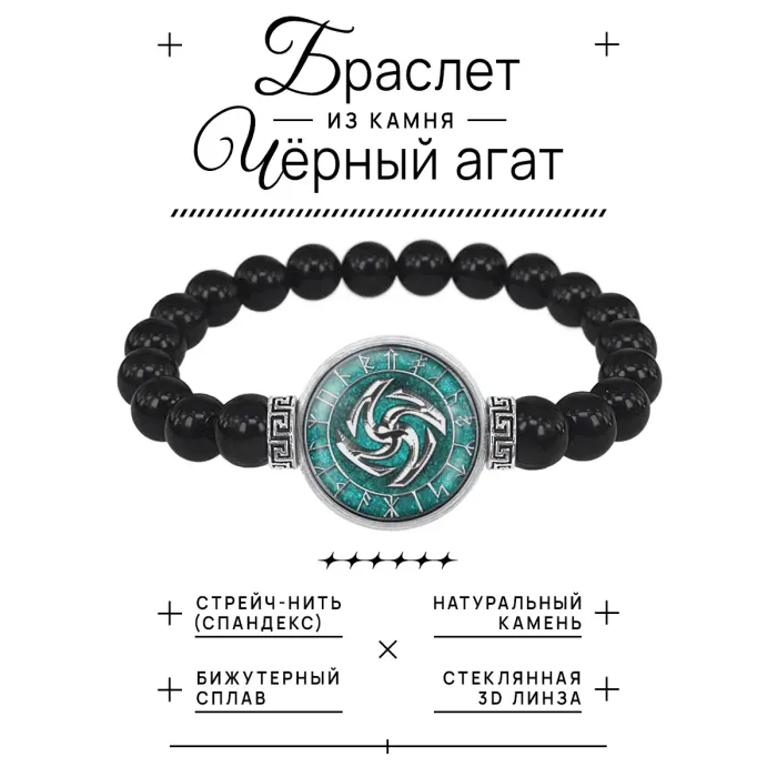 Стрейч-браслет с бусинами из чёрного агата и выпуклой стеклянной линзой с изображением.