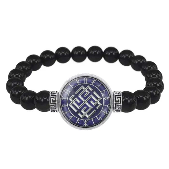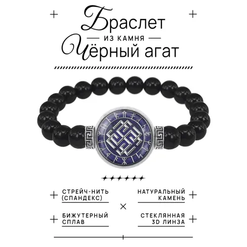 Стрейч-браслет с изображением славянского амулета Родимыч. Изготовлен из бусин чёрного агата и бижутерного сплава.