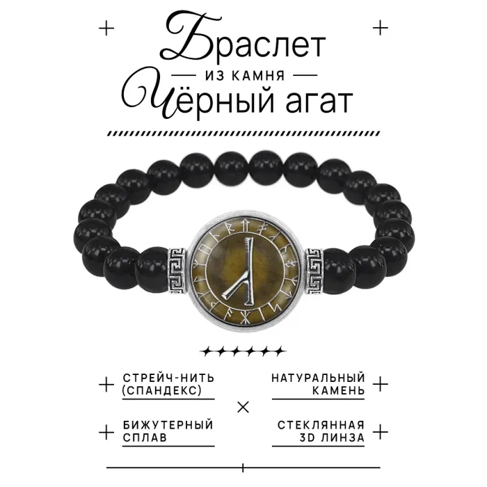 Стрейч-браслет с амулетом Алатырь из бусин чёрного агата и бижутерного сплава.