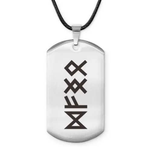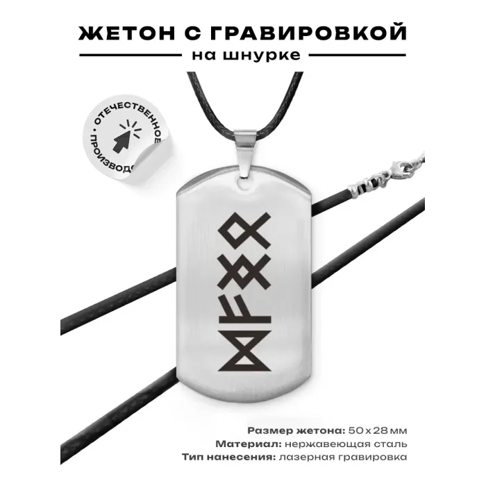 Амулет-жетон из полированной нержавеющей стали с нанесёнными рунами.