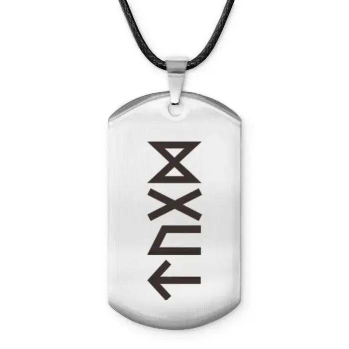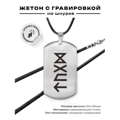 Амулет-жетон из полированной нержавеющей стали с гравировкой рун Тейваз, Уруз, Гебо и Дагаз.