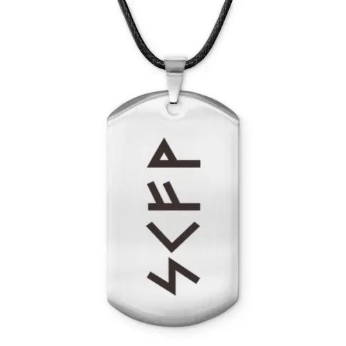 Амулет-жетон из полированной нержавеющей стали с нанесёнными рунами Соулу, Кеназ, Феху, Вуньо.