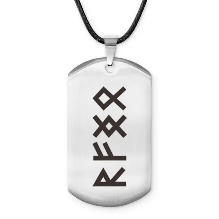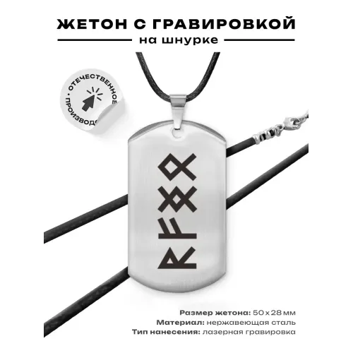Амулет-жетон из полированной нержавеющей стали с нанесёнными рунами Райдо, Феху, Ингуз и Одал.