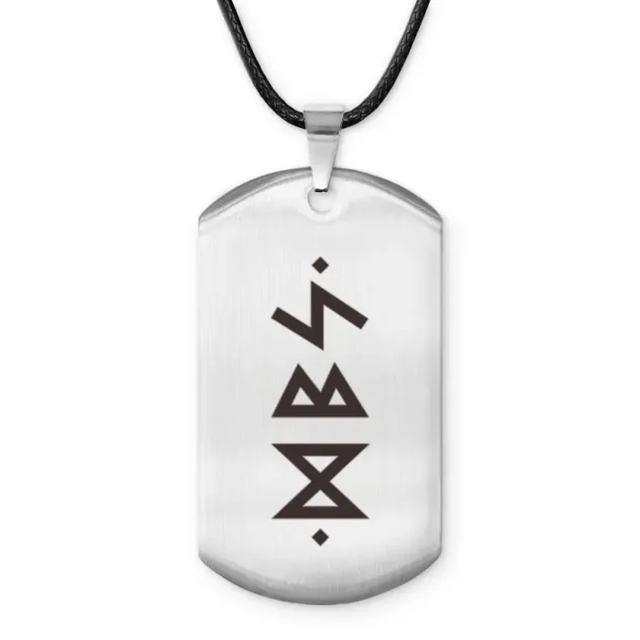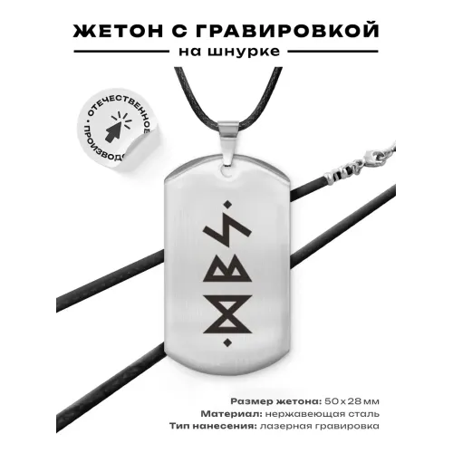 Амулет-жетон из полированной нержавеющей стали с нанесёнными рунами Дагаз, Беркана и Соулу.