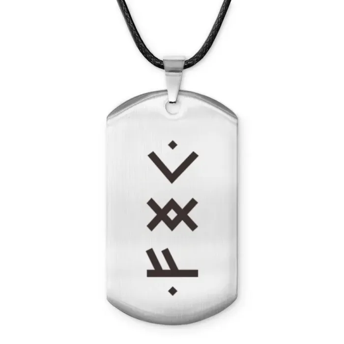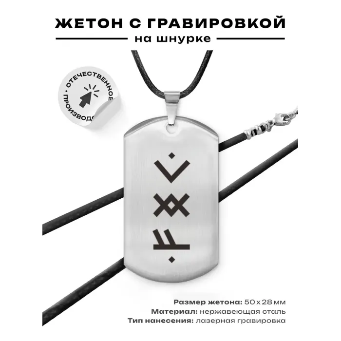 Амулет-жетон для активации трудолюбия из нержавеющей стали с нанесёнными рунами Феху, Ингуз и Кеназ.
