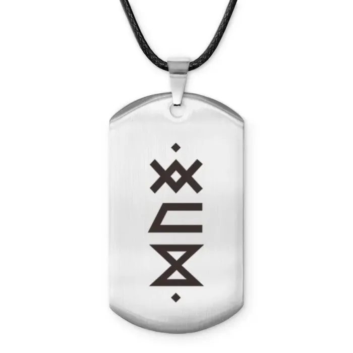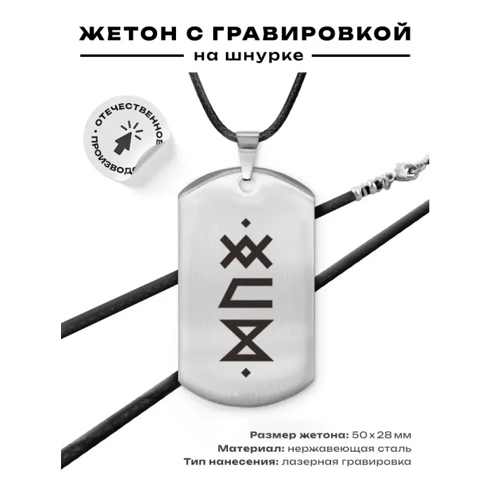 Амулет-жетон из полированной нержавеющей стали с нанесёнными рунами.