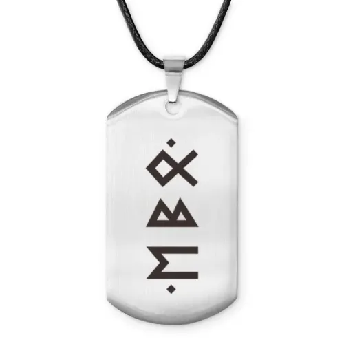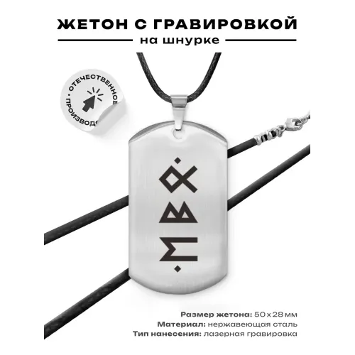 Амулет-жетон для сувенирного или личного ношения, выполненный из полированной нержавеющей стали с нанесённой рунической формулой.