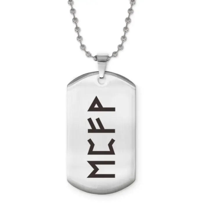 Сувенирный жетон на цепочке с символикой удачи. Изготовлен из нержавеющей стали, украшен рунической формулой.