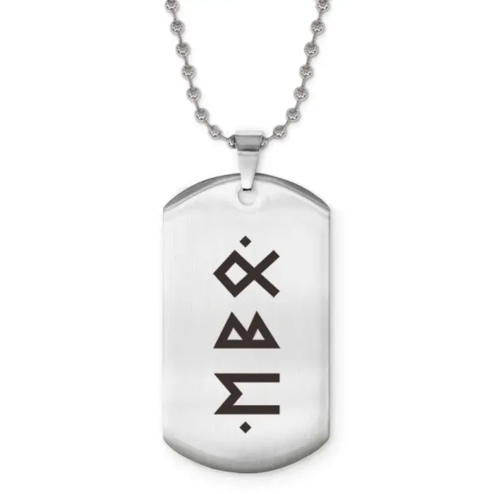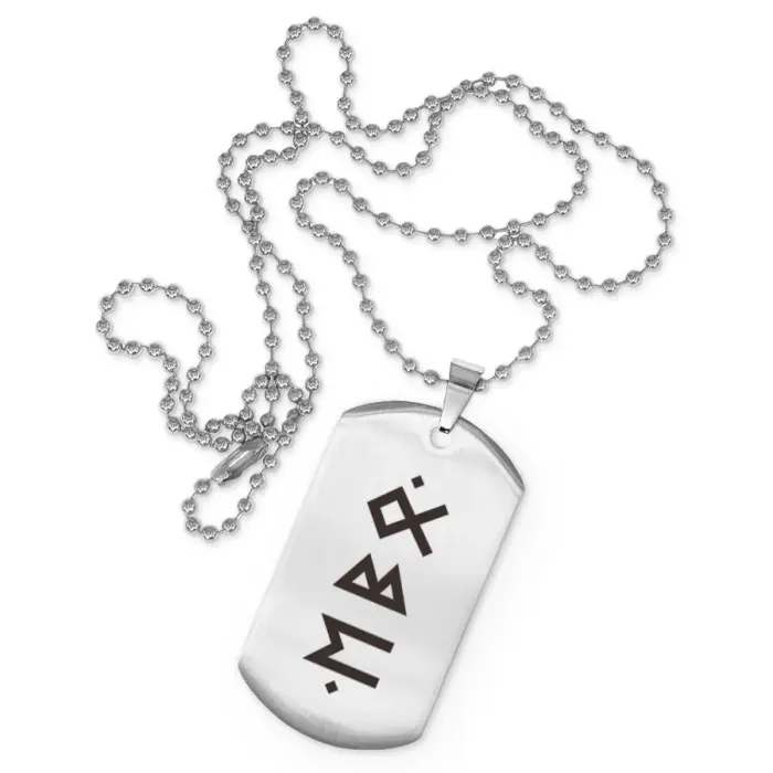Жетон на цепочке с рунической формулой. Изготовлен из нержавеющей стали с лазерной гравировкой.