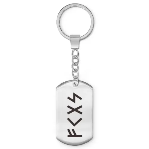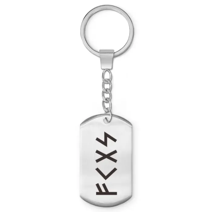 Брелок-жетон из полированной нержавеющей стали с рунической формулой.