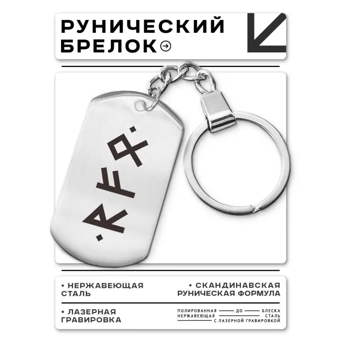 Брелок-жетон из полированной нержавеющей стали с гравировкой рун Райдо, Феху и Одал.