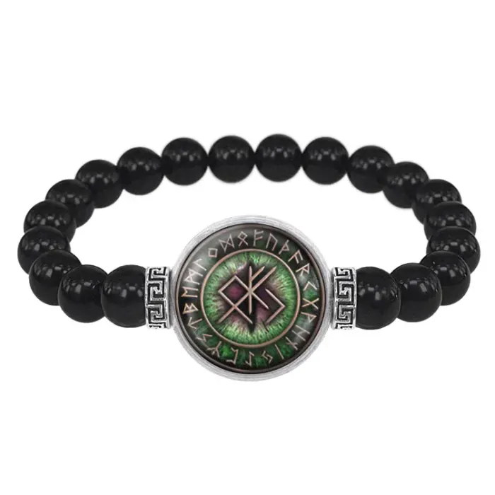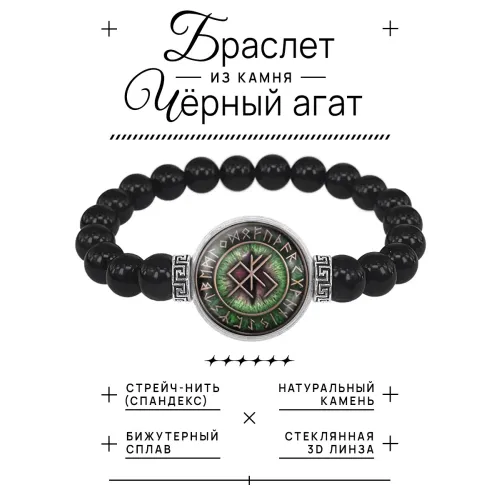 Материал и изготовление: Бусины из чёрного агата диаметром 8 мм, центральный элемент из бижутерного сплава с покрытием под серебро и выпуклой стеклянной линзой диаметром 20 мм. Изображение на амулете включает руны Одал, Феху и Йера.
