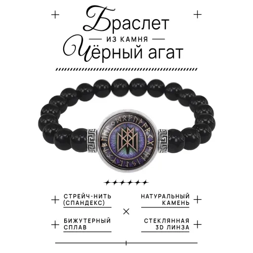 Материал и изготовление: Бусины из чёрного агата диаметром 8 мм, центральный элемент из бижутерного сплава с покрытием под серебро и выпуклой стеклянной линзой диаметром 20 мм. На элементе изображены руны Ансуз, Манназ и Дагаз.